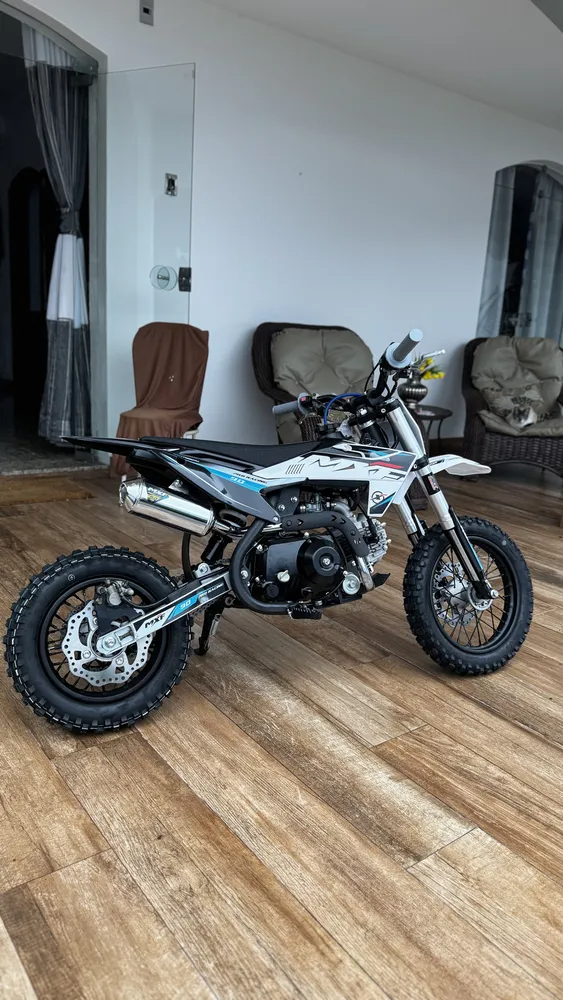 Presente de aniversário do meu sobrinho. A moto é lindíssima, toda em alumínio, suspensão muito boa. Ele anda no sítio todo dia e a moto aguenta tudo! Recomendo demais.
